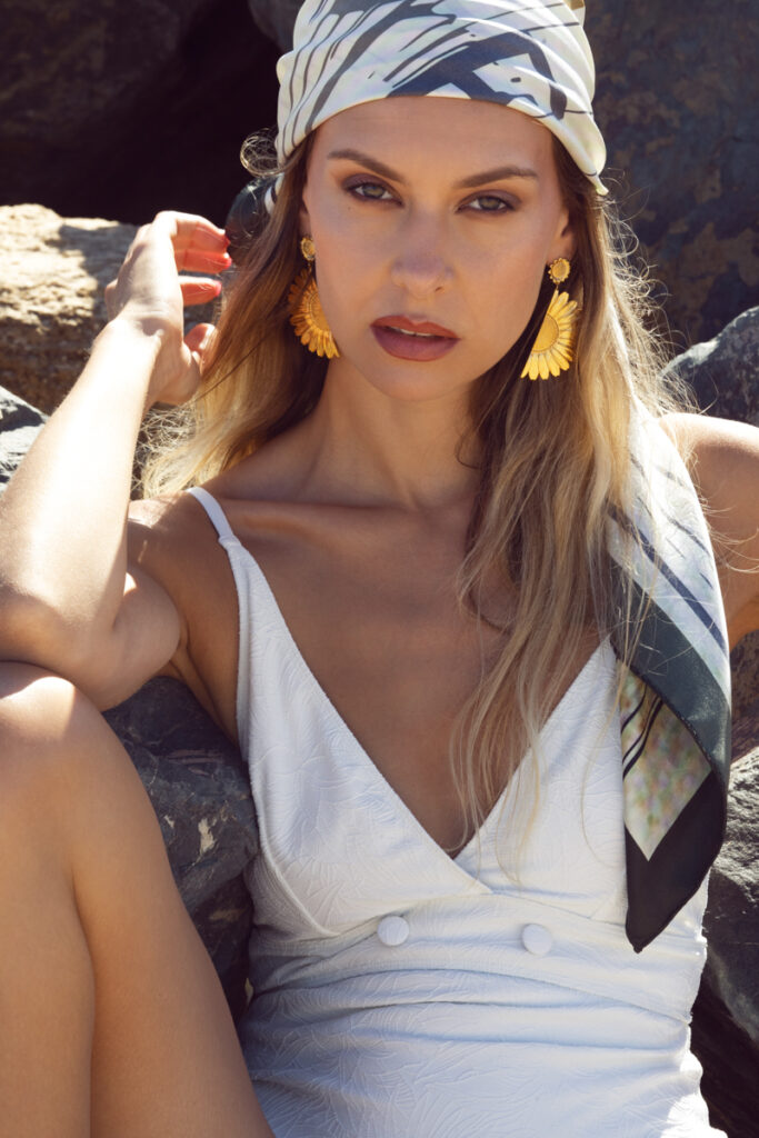 Pour cette collection estivale, nous avons imaginé un shooting à la fois chic et serein, inspiré par les lignes épurées du noir et blanc et l’harmonie entre la terre et la mer. Entre maillots de bain raffinés, costumes élégants portés sur le sable, et foulards flottant au vent marin, chaque pièce incarne le contraste subtil entre sophistication et naturel.